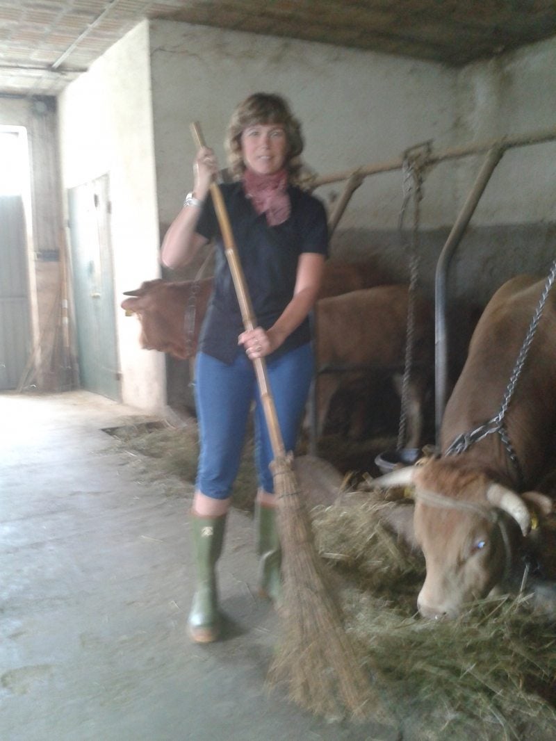 Na mijn vroege ochtendwandeling door het prachtige berglandschap, en twintig minuten relaxen bij een watervalletje, kom ik als een ander persoon de berg afgelopen. Bij de laatste bocht kijk ik even naar rechts en zie dat er een koe is ontsnapt. Omdat de boeren niet in de stallen zijn, besluit ik om er naartoe te gaan. Als ik ons huis passeer trek ik nog even mijn groene rubberlaarzen aan, en loop dan in mijn korte broek en T-shirt naar de stal. Het kalfje roept luid naar zijn moeder, die heerlijk van het verse gras eet. Als ze al grazend dichterbij komt, staat zij aan de ene kant, het kalfje en ik aan de andere kant van het schrikdraad! Ik snap niet hoe de koe daar is gekomen! Ik kijk in het rond, als ik niets kan vinden besluit ik via de stal naar de andere kant te gaan, in de hoop dat ik daar een schakelaar vind. Maar nee, geen stoppenkast of accu te vinden waar de elektriciteit vandaan zou kunnen komen! Dan loop ik naar de koe en terwijl ik voorzichtig in mijn handen klap, verplaatst zij zich richting de stal. Daar lopen we dan, de koe en ik, heel gemoedelijk, alsof we dat elke dag doen! Dan hoor ik een stem en kijk op.